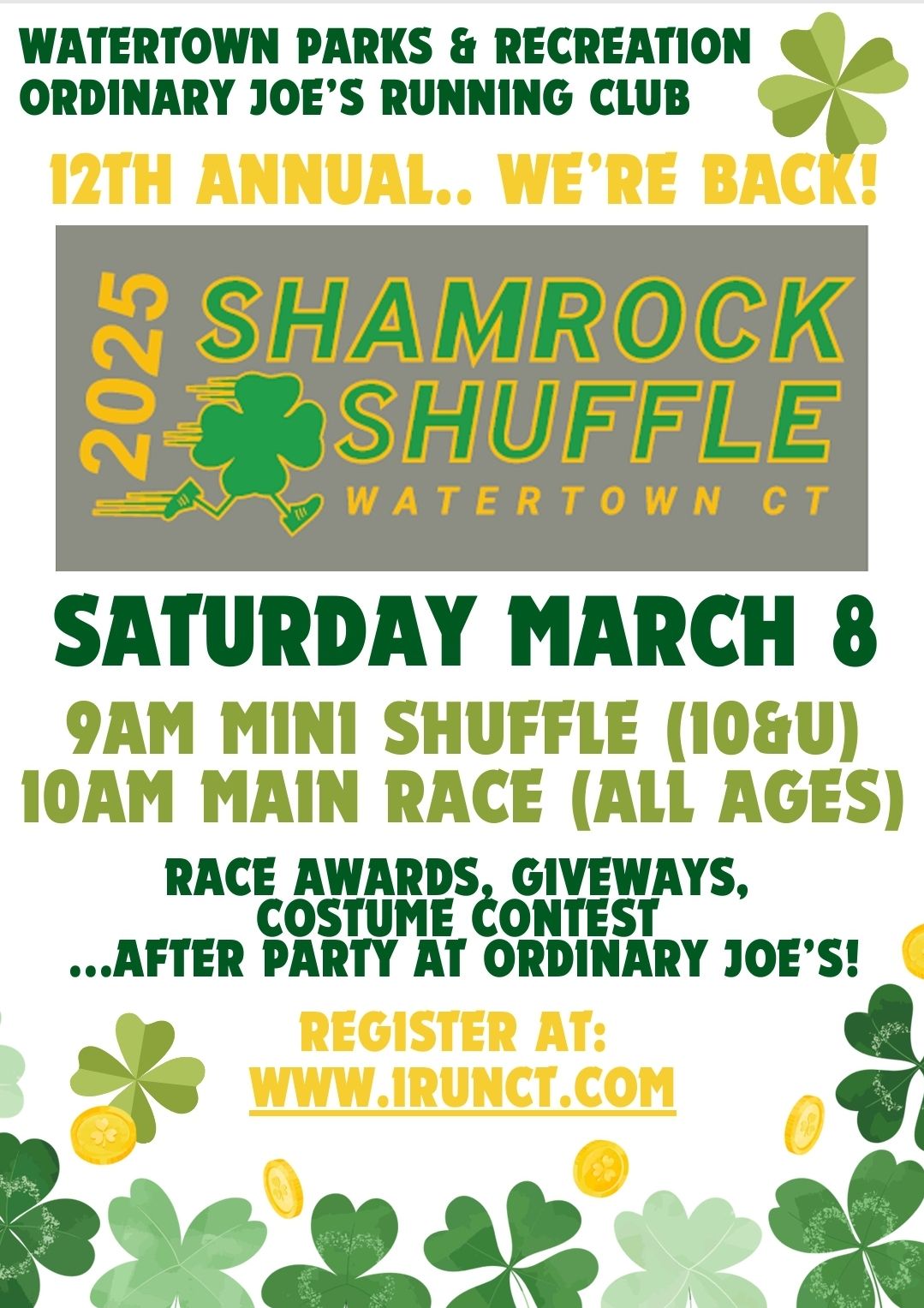 Baribault Fuel is proud to support and sponsor the 2025 Shamrock Shuffle of Watertown/Oakville. The 12th Annual Shamrock Shuffle will be March 8th in Watertown, Connecticut. Come run or walk with us, have fun, and raise money for local charities.